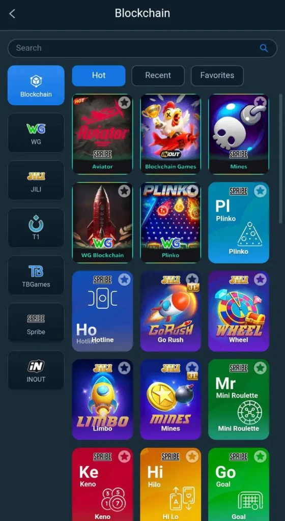 - Different types of slot and card games